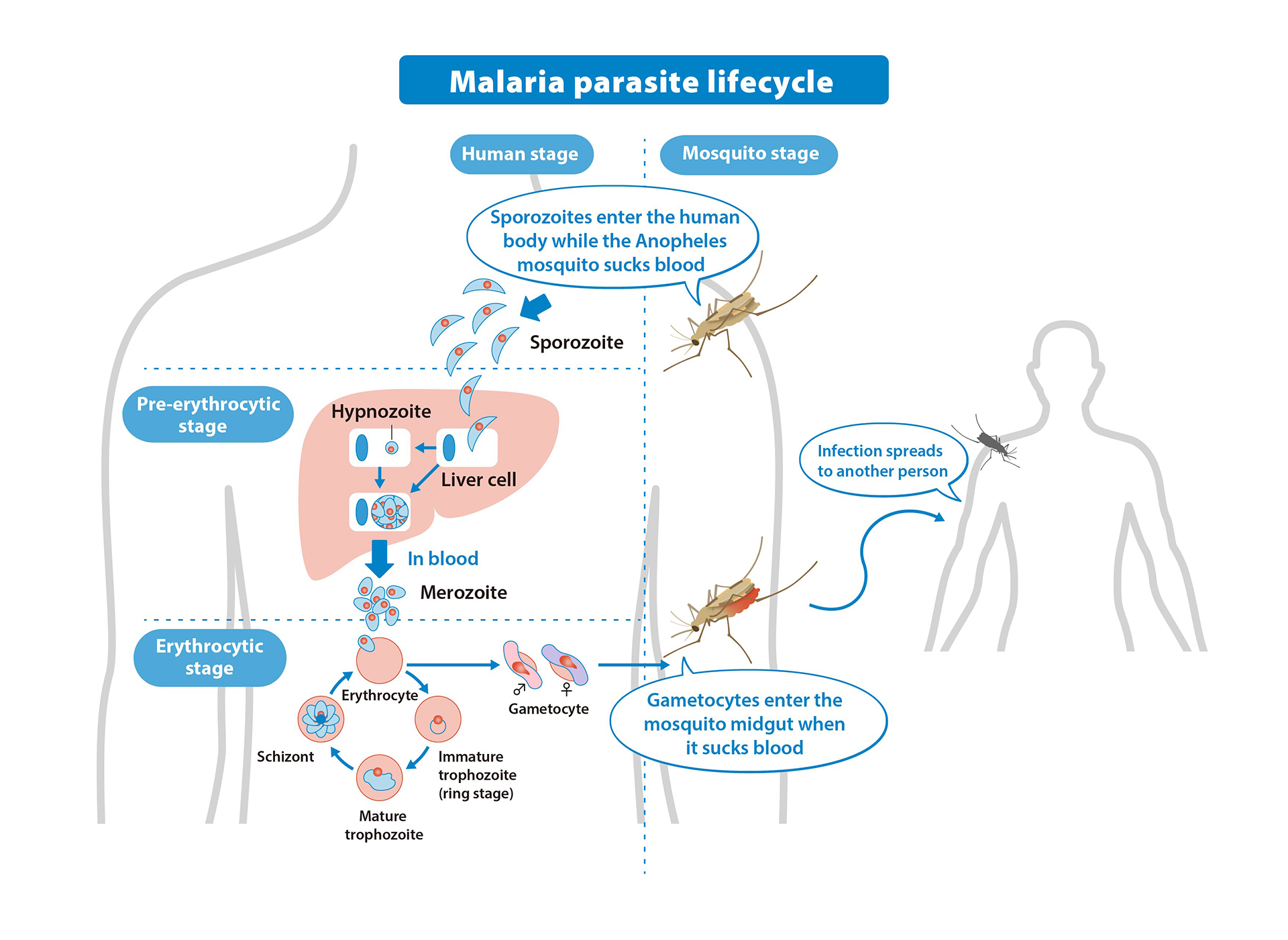 - When an Anopheles mosquito carrying malaria parasites bites a human, the parasites are injected into the body in the form of "sporozoites" hidden in the mosquito's saliva. The sporozoites reach the liver and invade the liver cells. At this stage, some parasites enter a dormant stage and can cause a relapse in the infected person a few weeks to several years later. On the other hand, parasites growing in the liver cells proliferate into several thousands in "merozoite" form, then released into the bloodstream.
