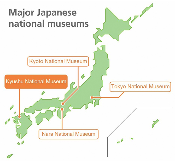 Japan is well represented with its four national museums. Each possesses its own characteristics, with the Tokyo National Museum based on oriental cultural assets centered on Japan having the longest history. The Kyoto National Museum features Kyoto’s own particular culture, while the Nara National Museum presents Buddhist art. The Kyushu National Museum, which we focus on here, is based on the theme of exchange between Japan and other countries in Asia.