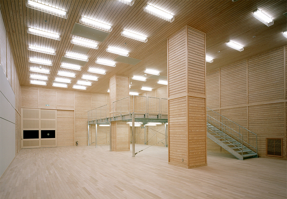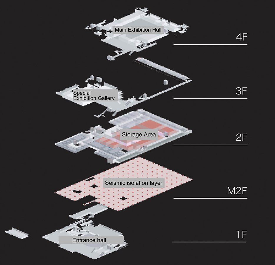 Most of the second floor is designated as Storage. In order to minimize influence from outside, the entire storage area employs a double wall structure. By constantly controlling temperature and humidity via air conditioning, together with the use of woods such as cedar board for the interior material, humidity can be gently adjusted as necessary. An important feature of the building’s construction is its seismic base isolation system installed in the mezzanine floor beneath the storage section. This means that the entire storage area and all of the exhibition spaces are constructed upon this seismic base isolation layer.