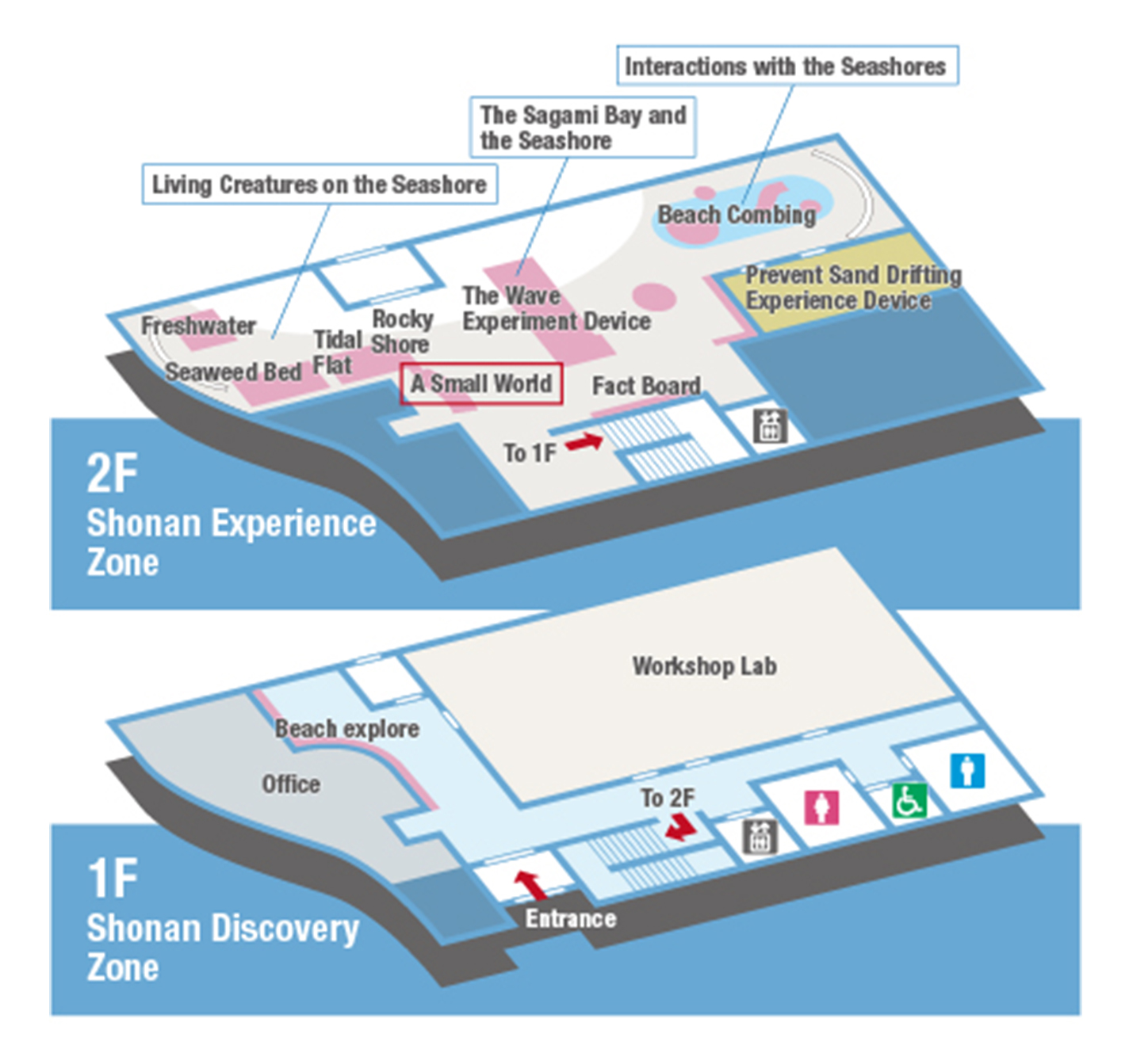 Chief Curator of Experiential Learning Mai Kasamatsu explains, "The Beach Experience Hall is where you can interact with the Shonan seashore and learn about its importance, which will help facilitate you to think and act. Based on this theme, we plan various events and exhibitions." This building has two stories, the first floor being the Shonan Discovery Zone and the second floor featuring the Shonan Experience Zone.