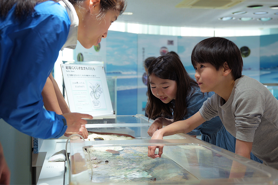 At the Shonan Experience Zone, there is a section called "Living Creatures on the Seashore" with aquariums reproducing habitats of creatures that live along the seashore. In the rocky water tank, which reproduces a tidal pool of rocky shores, tidal flats and seaweeds, you can actually touch hermit crabs and starfish. In addition, it introduces a mechanism that creates a tombolo (sandbar connecting the shore with an island) due to the breaking waves. It also displays various drifting objects carried by the ocean current and demonstrates how to curtail sea breezes and flying sand.