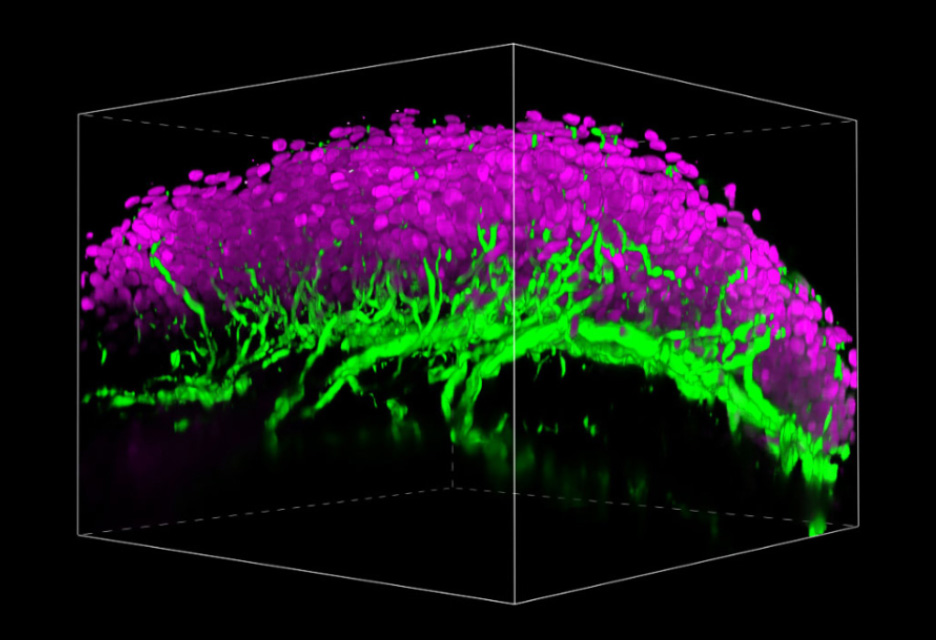 Image of deep skin taken by the multiphoton confocal microscope (nerve fibers in green).