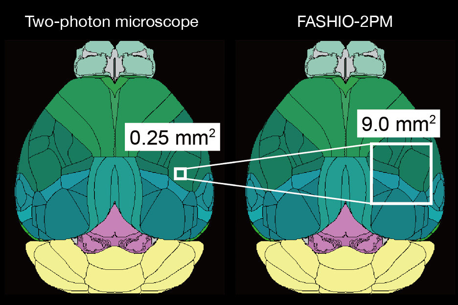 Although it has been possible to monitor brain activity with a conventional laser microscope, it was limited to a very narrow area. To overcome this issue, wide-field microscopes have been developed recently. However, due to the trade-off relationship between resolution and sensitivity, the images from these microscopes tended to be dark and unclear, with a shooting speed of about one frame per second, making it impossible to accurately track instantaneous changes in brain activity. The FASHIO-2PM can capture a high-sensitivity image of a wide 3x3mm field-of-view with cell-level resolution that shows multiple areas of the brain simultaneously. It can also capture instantaneous changes at a speed of 7.5 images per second. “When I played this video at a symposium, people were amazed. So, I feel that this microscope is really something special,” explained Dr. Murayama during the development announcement.