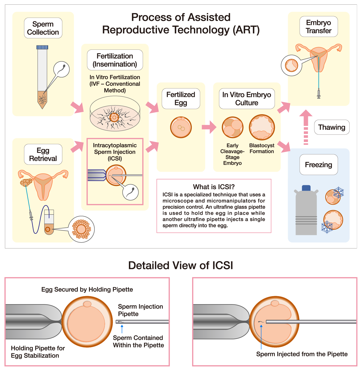 ART involves fertilizing eggs with sperm outside the body, culturing the resulting embryos, and transferring them to the uterus. There are two primary methods of fertilization. Conventional IVF involves adding sperms to a culture medium containing the egg, allowing natural fertilization to occur. On the other hand, intracytoplasmic sperm injection (ICSI) directly injects a single sperm into an egg using an ultrafine glass pipette. Once fertilized, embryos are cultured in an environment that mimics the human body, progressing through cell division to the blastocyst stage, and are then transferred to the uterus based on the patient’s condition.