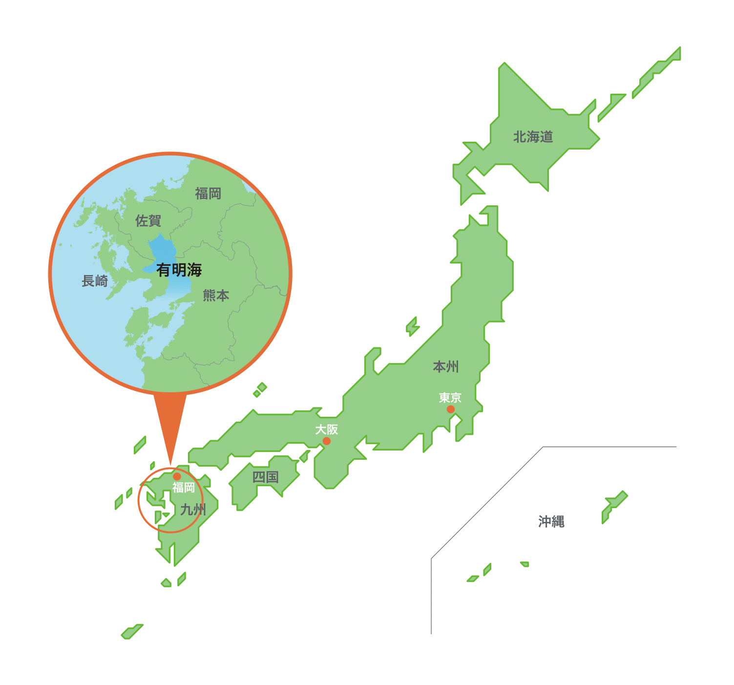 その答えは、環境にあります。有明海は伊勢湾とほぼ同じ大きさの袋状の湾。遠浅で広大な干潟が発達し、筑後川をはじめとするたくさんの河川が流れ込み、ノリの生育に必要な栄養塩(窒素やリンなど)が豊富です。さらに干満の差が最大で6メートルもあるため潮流も速く、ノリが栄養塩を吸収しやすいなど、有明海特有の環境からノリ養殖の適地となっているのです。