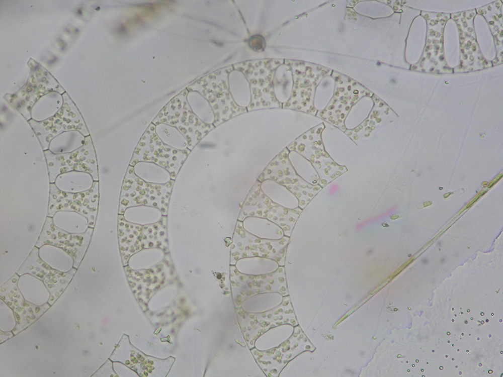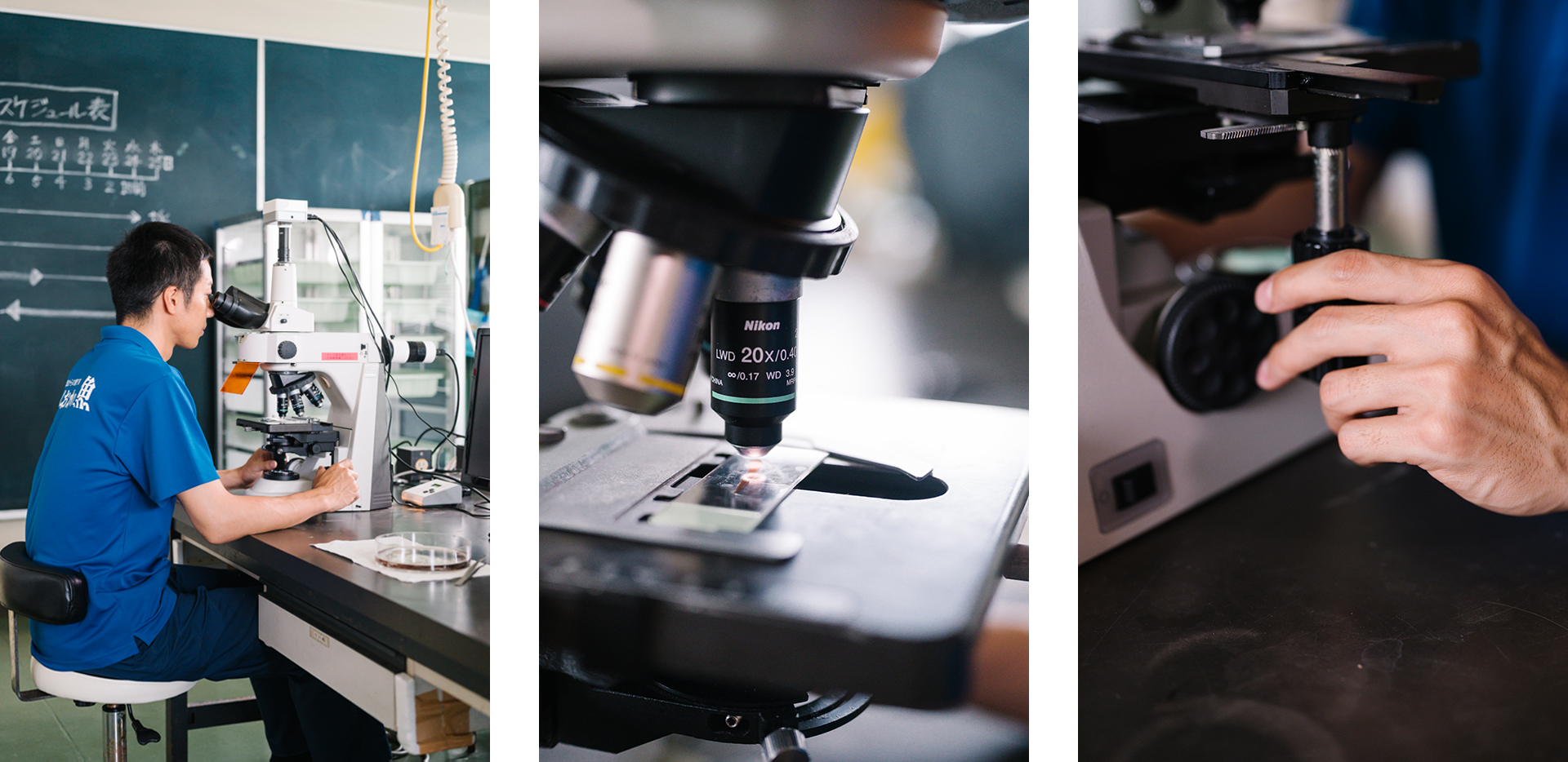 ノリの養殖には、大きく採苗(ノリ網に殻胞子を付着させること)前と採苗後の二つの工程があり、そのどちらでも顕微鏡が使われます。