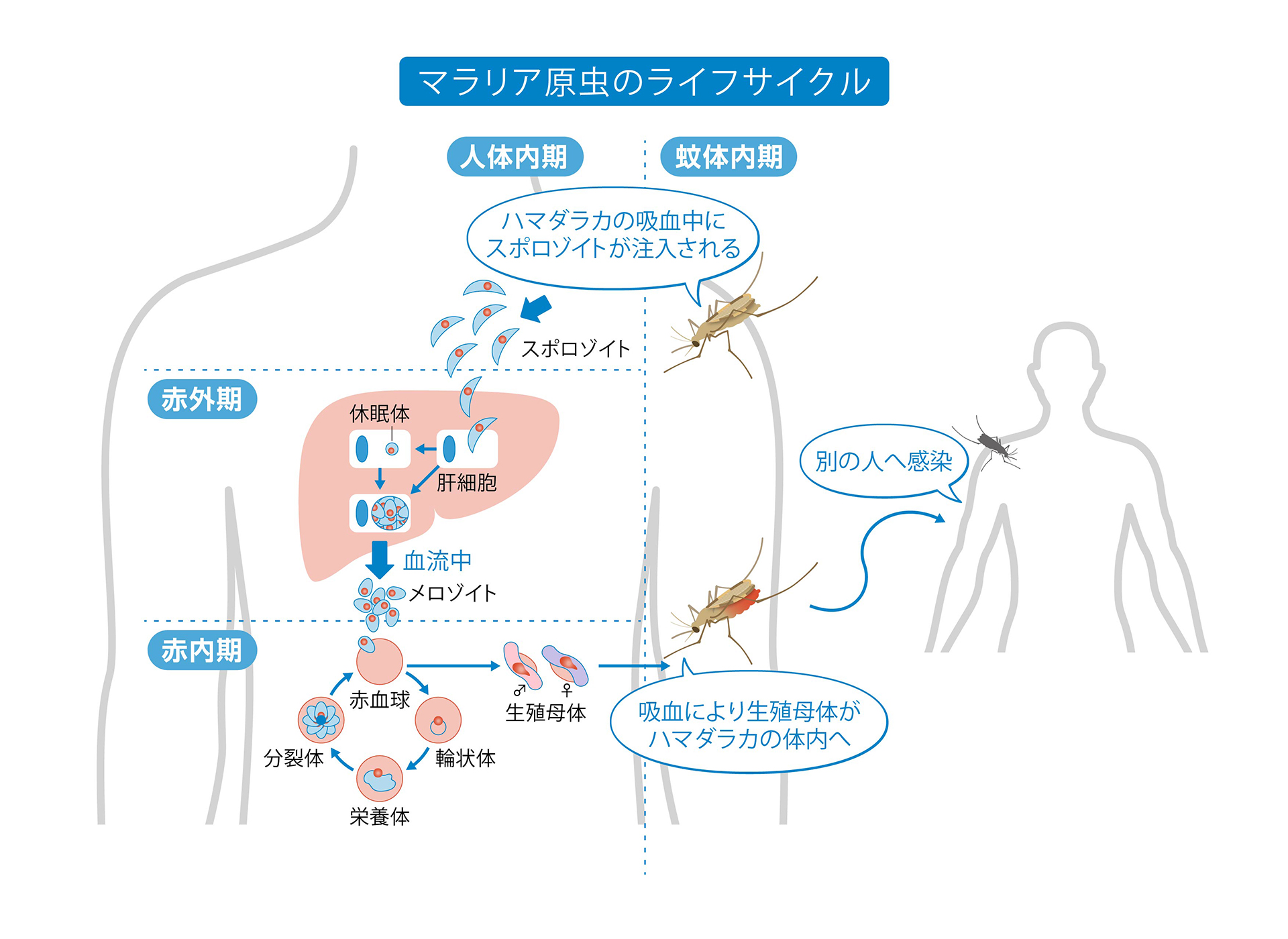 マラリア原虫ライフサイクルは実に複雑です。大きくは、人の肝細胞内の『赤外期』、赤血球の中の『赤内期』、ハマダラカの中の『蚊体内期』という三つのステージがあります。