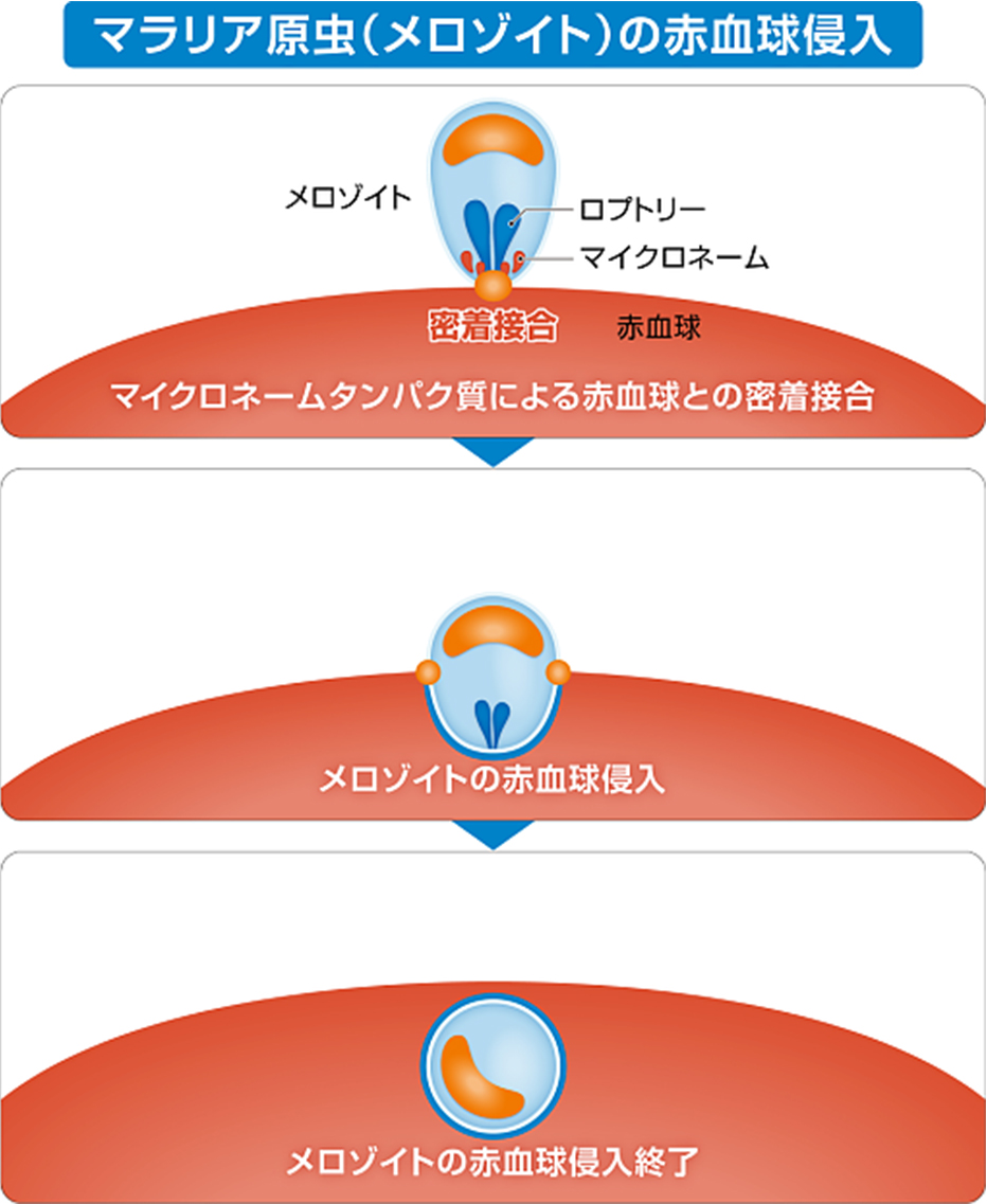 - “メロゾイト”は次に赤血球に侵入します。そこで十数個前後に分裂した後、再び血流中に放出され、また新たな赤血球に侵入するというサイクルを繰り返します。さらに赤血球内の原虫はときおり雌雄の生殖母体に分化します。