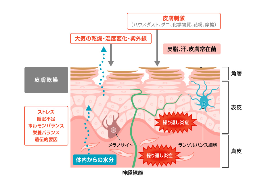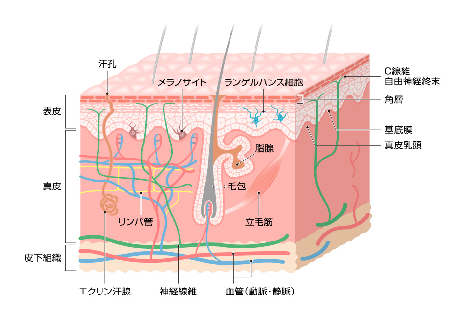 傳田さんは、皮膚の角層直下まで広がっている神経の働きを研究しています。皮膚は2mmほどの厚さですが、そこには皮膚への刺激やストレスを感じ取るための多くの器官が含まれており、表皮ケラチノサイト、免疫細胞から分泌される物質の影響と合わせて、さまざまな神経反応が現れます。そのメカニズムを解明することで、敏感肌の人も使用できるような化粧品開発のための基礎研究に取り組んでいます。