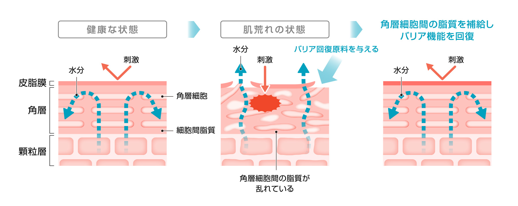 ・上:角層から基底層 ・下:顆粒層から基底層(物質が本来届かない顆粒層にまで達している)
