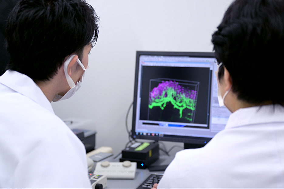 そこで活躍するのが多光子顕微鏡。近赤外線を利用して肌の深部を克明に捉えることができます。しかも組織が生きた状態での観察が可能で、かつ3次元の画像データを取得することができるため、肌への刺激に対する反応や、化粧品の原料が浸透する過程、その原料が浸透後どのくらい保たれるのかなどをリアルタイムで知ることができるのです。