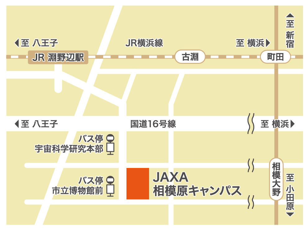 「市立博物館前」下車徒歩2分 - 小田急線「相模大野駅」北口より神奈川中央交通バス(相05相模原駅南口行き)「大野台三丁目」下車徒歩10分、(相02相模原駅南口行き)「宇宙科学研究本部」下車徒歩5分