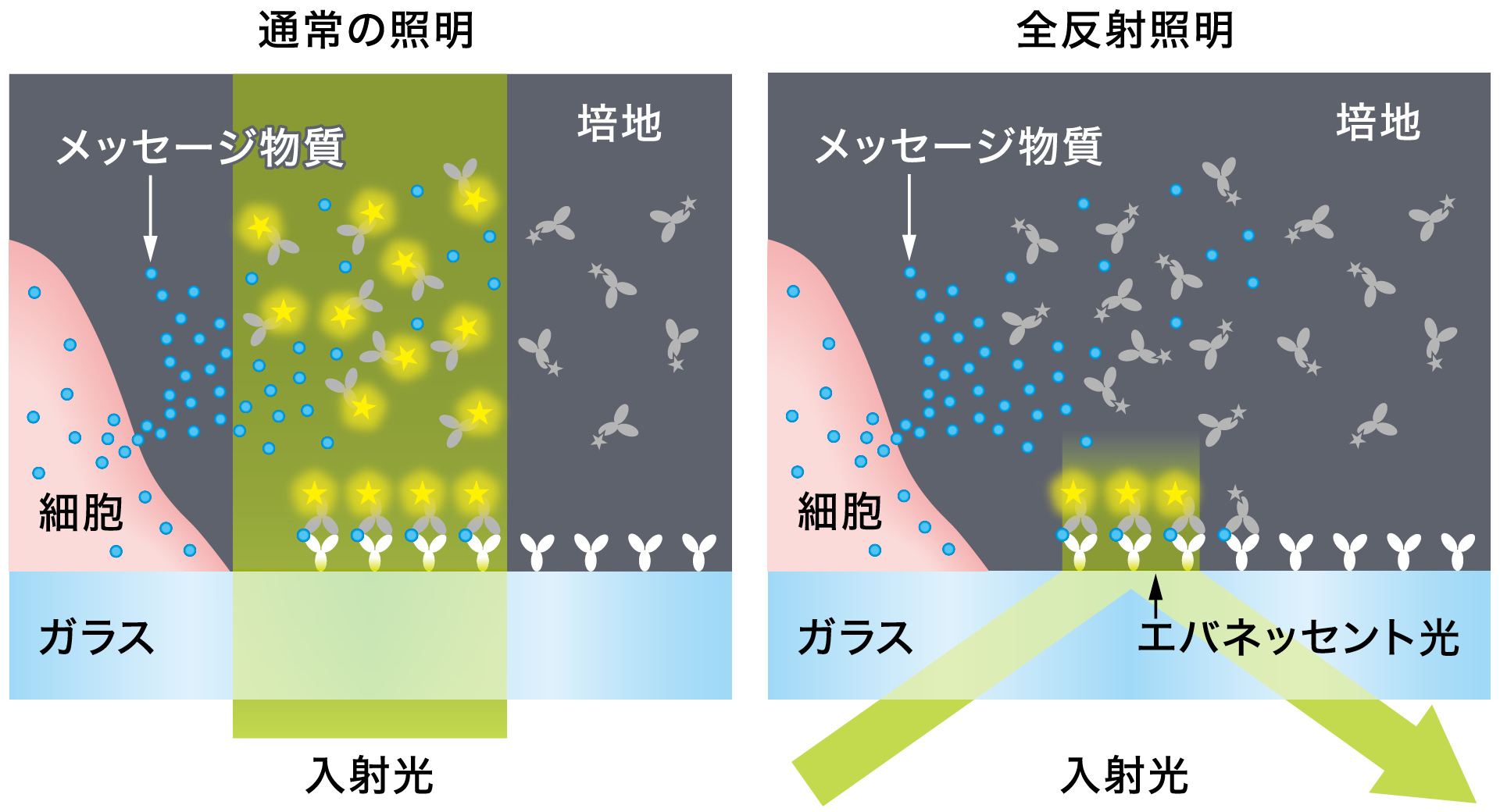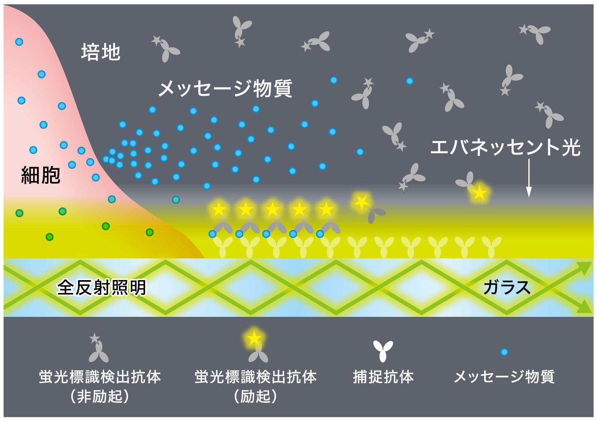 LCI-Sの原理は抗原・抗体検査※1と1分子蛍光イメージングで用いられる全反射照明顕微鏡法の組み合わせです。抗原・抗体検査は細胞をのせたガラスの表面に細胞から放出されたメッセージ物質を捉えて蛍光色素で可視化する方法です。可視化するためにより多くの蛍光色素を添加しますが、見極めたい物質以外の蛍光も検出してしまい判定がしづらくなるため、従来は余剰の蛍光色素を洗い流す必要がありました。一方LCI-Sでは、全反射照明という特殊な方法で蛍光色素に光を当てます。この手法を用いるとエバネッセント光※2という現象でガラス表面からほんのわずかの距離にしか光が届きません。これによって余剰な蛍光色素を洗い流すことなく、ガラス表面付近のメッセージ物質のみを光らせることができるのです。